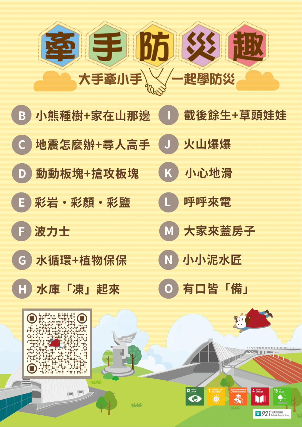 園區致力於推廣地震科學、建築安全及防災教育,特別規劃旨揭活動,透過套裝課程,帶領大家從多元主題來認識地震與防災。 |