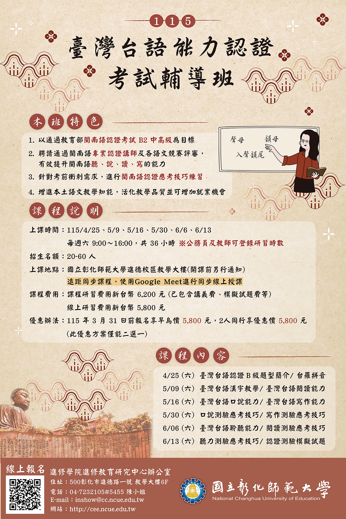 (二)課程時間:115年4月25日~115年6月13日,週六 9:00~16:00,共計36時,公務人員及教師可登錄研習時數。