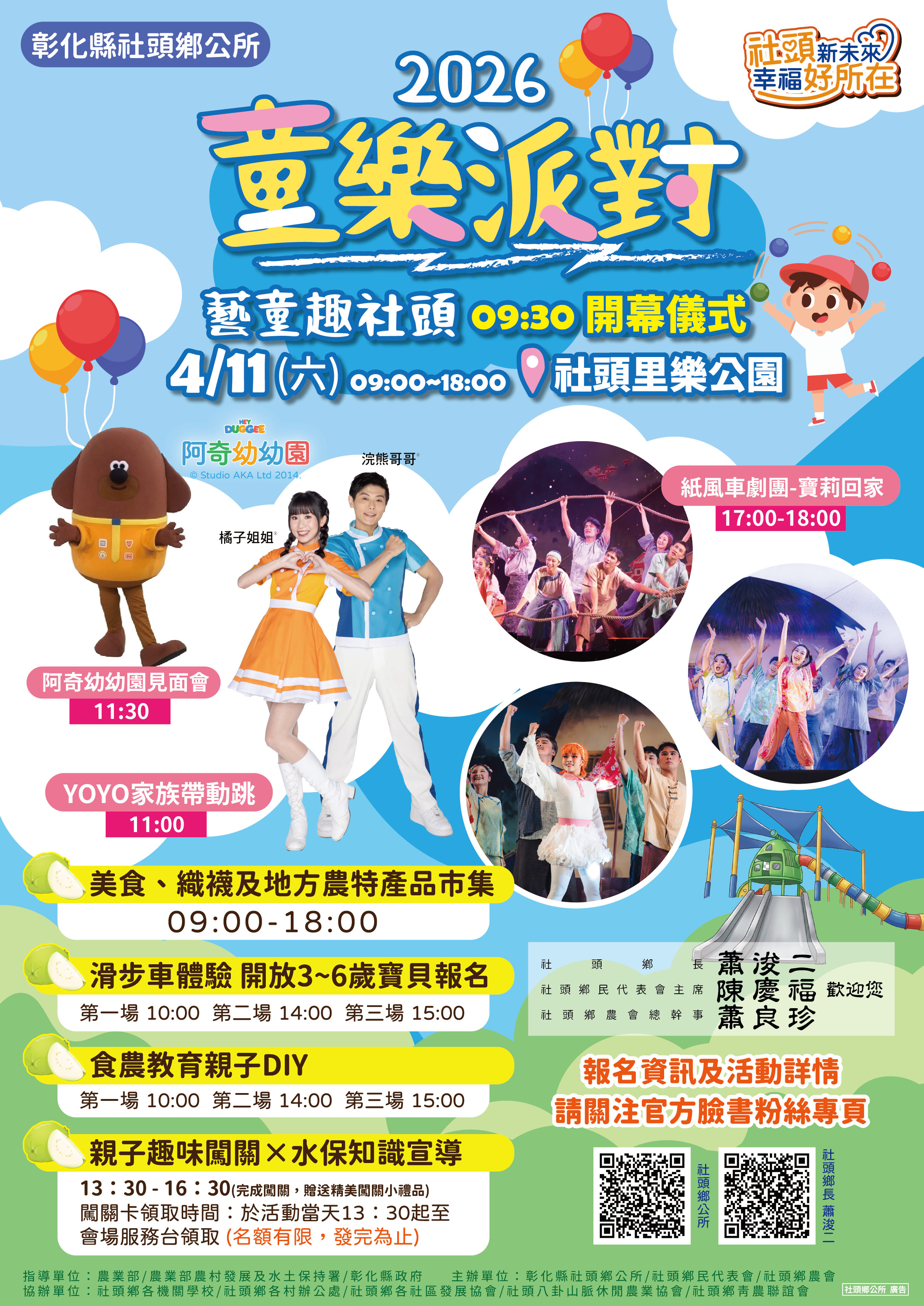 4/11(六) 17:00 地點: 社頭里樂公園(彰化縣社頭鄉員集路一段327號) 主辦單位:社頭鄉公所 詳情請參閱附檔海報喔!