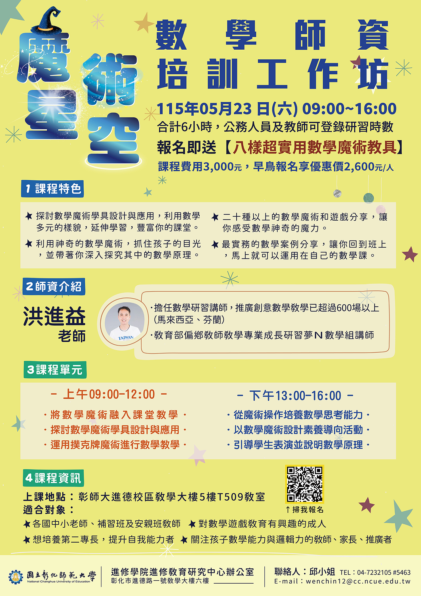 轉知國立彰化師範大學 進修學院推廣教育「魔術星空數學師資培訓工作坊」、「課後才藝安親照顧培訓師乙級鑑定輔導班」、「115年中小學教育領袖經營素養增能班」招生簡章