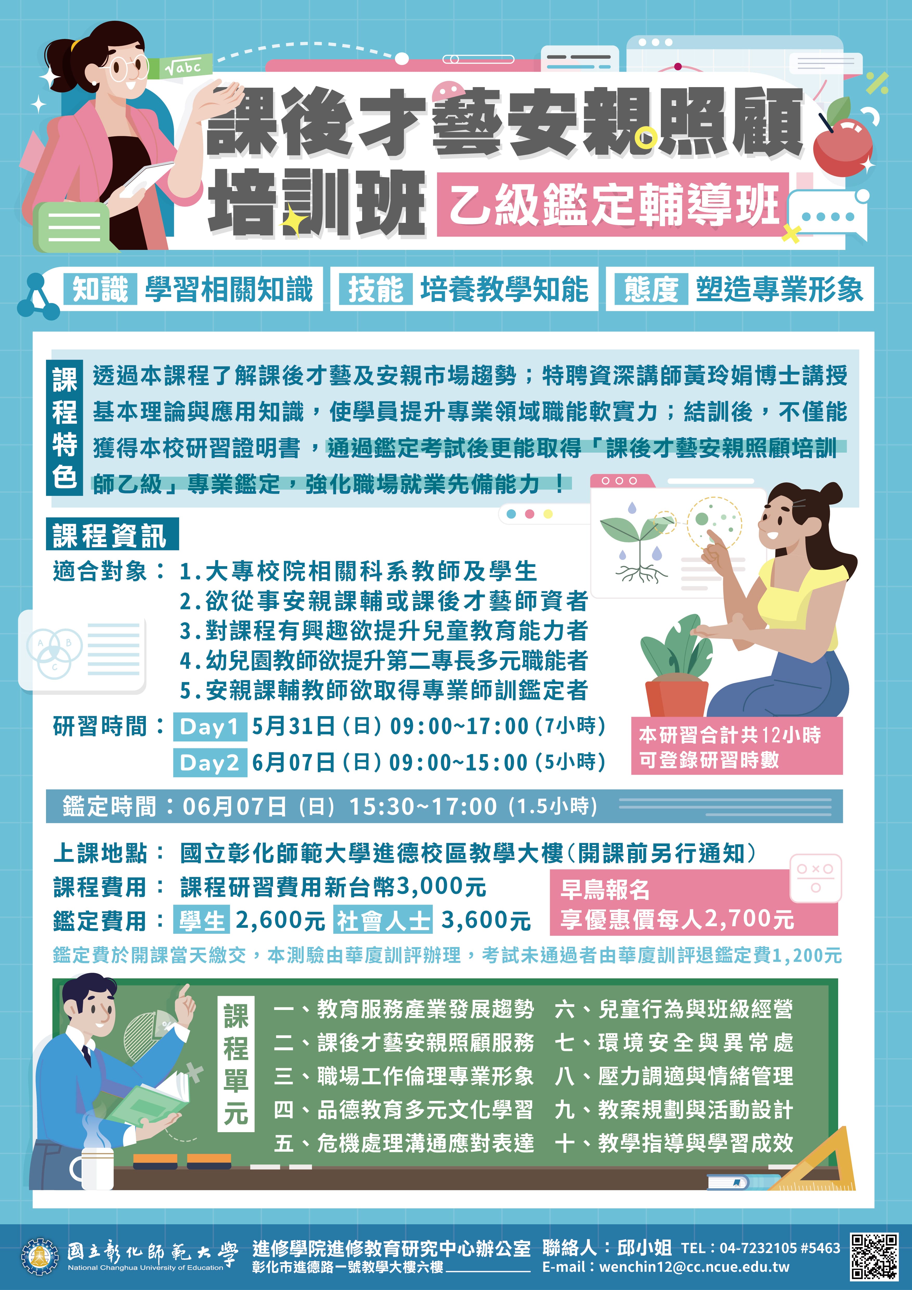 如有相關問題,請向本校進修學院進修教育研究中心洽詢 : 04-7232105 分 機 5463 邱 小 姐 , E-mail :wenchin12@cc.ncue.edu.tw。 |