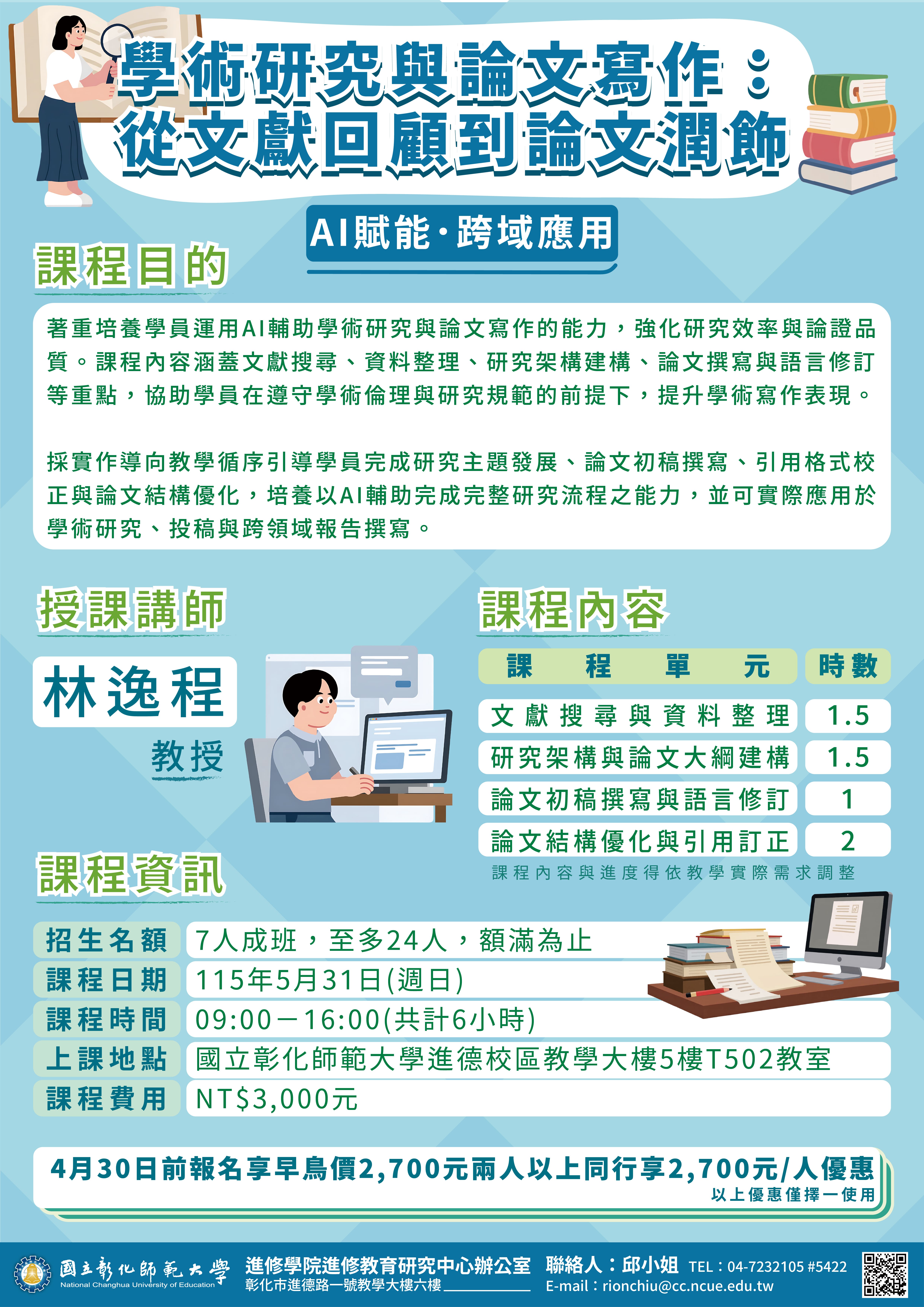 課程費用:3,000元,開課前1個月報名享早鳥價2,700元;兩人以上同行每人享2,700元優惠。以上優惠擇一使用,不可併用。【AI賦能.跨域應用】學術研究與論文寫作舊生另享優惠2,500元。 |