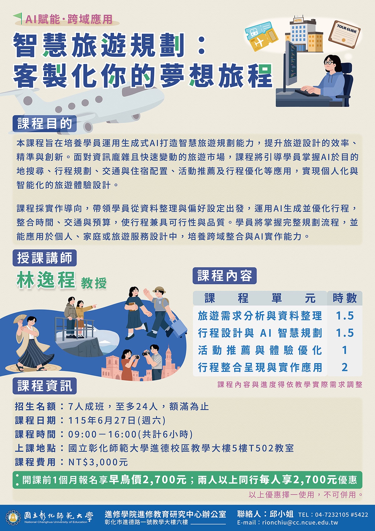 課程特色:課程採實作導向,運用AI生成並優化個人化旅遊行程,整合時間、交通、預算,培養完整規劃能力,並應用於個人或企業專案。 |