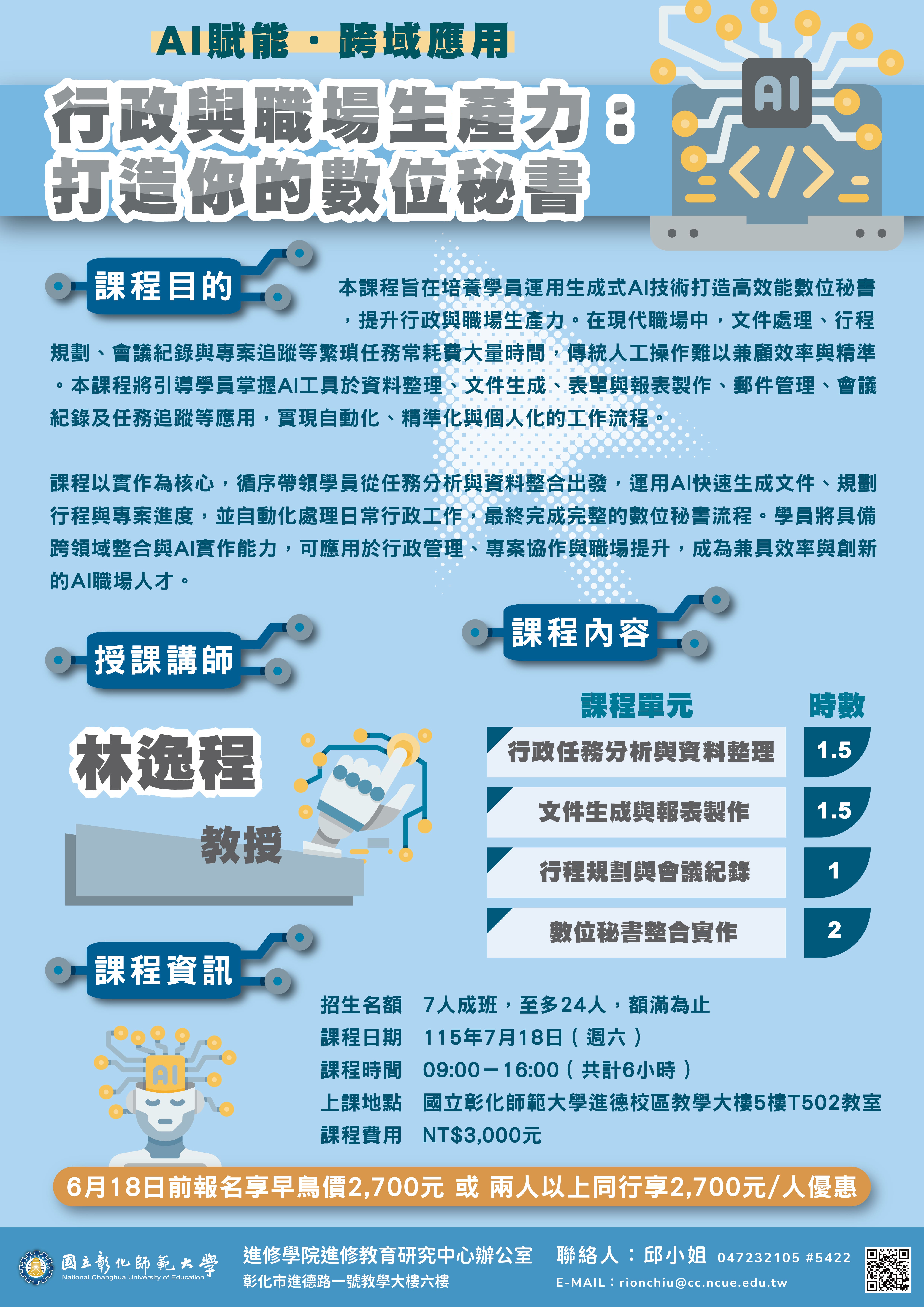課程時間:115年7月18日(週六) 09:00-16:00,共計6小時。 |